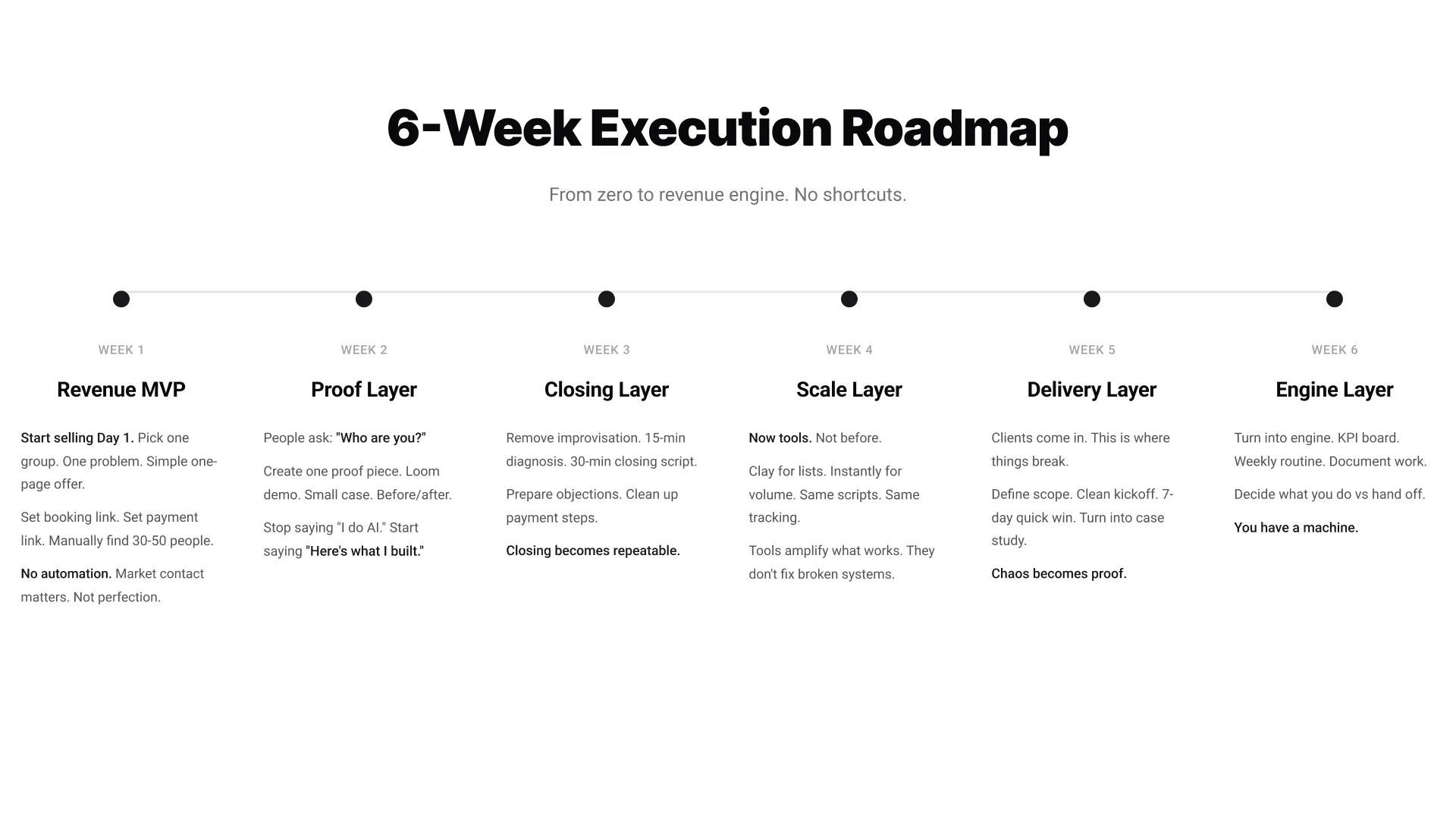 It is a 6-week execution cohort designed to kill learning addiction and force real market execution until revenue becomes real.